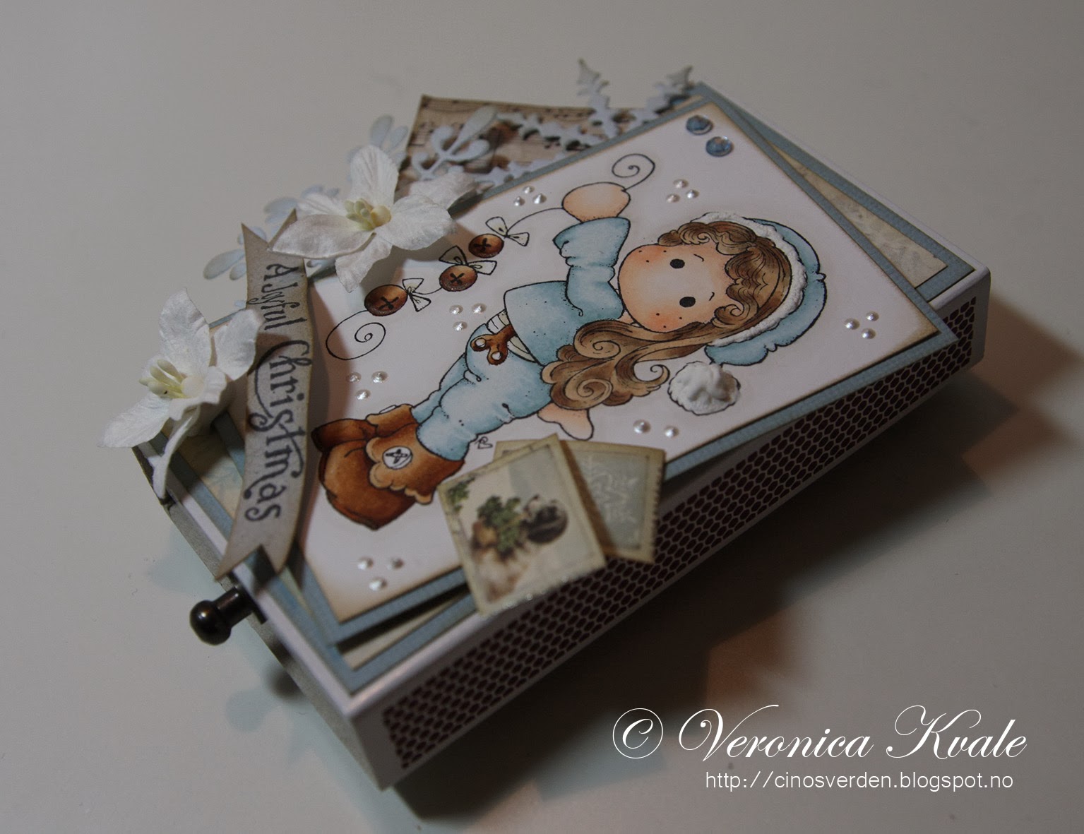 Sett fra siden. Jeg prøver å ikke ha så mye pynt på utsiden der man tenner fyrstikkene. Er jo ikke så mye om å gjøre å sette fyr på hele eska... De søte frimerkene kommer fra et mønsterark fra Pion Design.